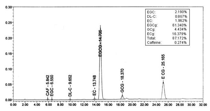 Catechins เป็นส่วนประกอบหลักในโพลีฟีนอลชาซึ่งประกอบด้วย EGC, DL-C, EC, EGCG, GCG และ ECG สารประกอบเหล่านี้แสดงคุณสมบัติทางเภสัชวิทยารวมถึงสารต้านอนุมูลอิสระ, ยาปฏิชีวนะ, ยาต้านไวรัส, ต้านมะเร็งและสารต้านการต้านการแข็งตัวในขณะเดียวกันก็เพิ่มการทำงานของระบบภูมิคุ้มกันและลดไขมันในเลือดและสเตียรอยด์